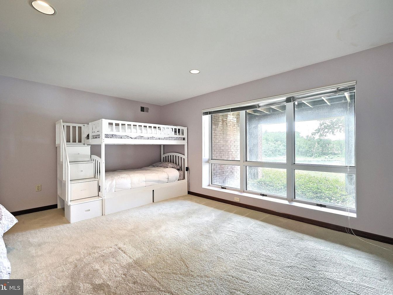 This bedroom features a spacious layout with a plush carpeted floor in a soft beige tone that adds warmth and comfort. On one side, there is a white wooden bunk bed with a staircase that doubles as storage drawers, combining functionality with a clean, modern design. The walls are painted in a gentle lavender-gray hue, providing a serene and calming atmosphere. A large window spans almost the entire width of one wall, allowing abundant natural light to flood the room and offering a clear view of the greenery outside. Ceiling recessed lights provide additional illumination for the space.