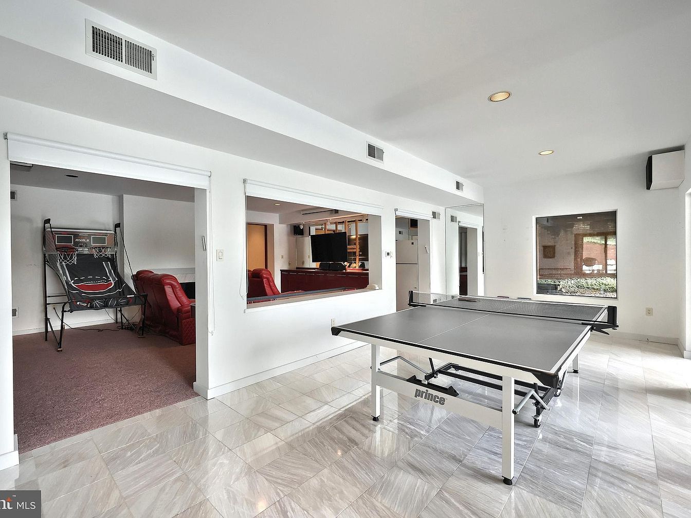 This bright and spacious game room features a sleek, modern aesthetic with clean white walls and glossy light-gray marble tile flooring that adds a polished feel. A black and white Prince ping pong table anchors the space, inviting fun and activity. Large windows and a wide interior opening connect the room to an adjacent lounge area, which is carpeted in soft brown and furnished with deep red reclining chairs for relaxation. In the lounge, an electronic basketball arcade game adds extra entertainment. The overall design balances leisure and comfort with contemporary simplicity.