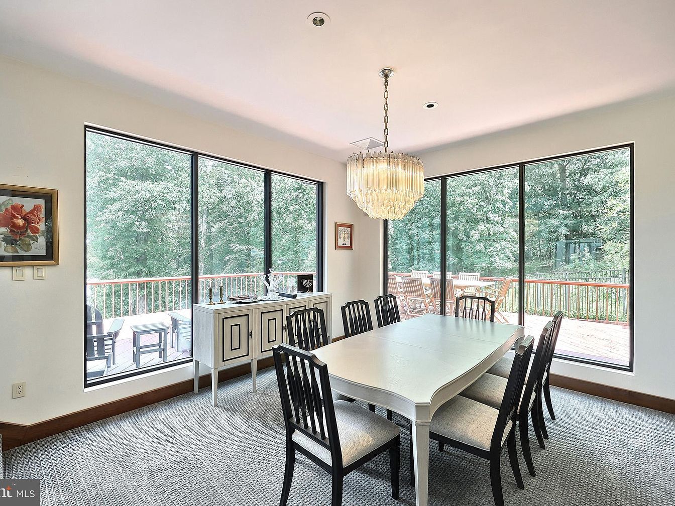 This spacious dining area features a classic, elongated white dining table surrounded by eight black wooden chairs with light cushioned seats, offering ample seating for gatherings. The room is brightened by large floor-to-ceiling windows that provide a stunning panoramic view of the lush, green backyard and deck beyond. Soft neutral walls complement the light grey carpet with subtle texture, creating a calm atmosphere. A sophisticated tiered chandelier hangs centrally, adding elegance and a focal point. A stylish white sideboard rests against the windows, adorned with decorative pieces, enhancing the room’s refined yet inviting aesthetic.