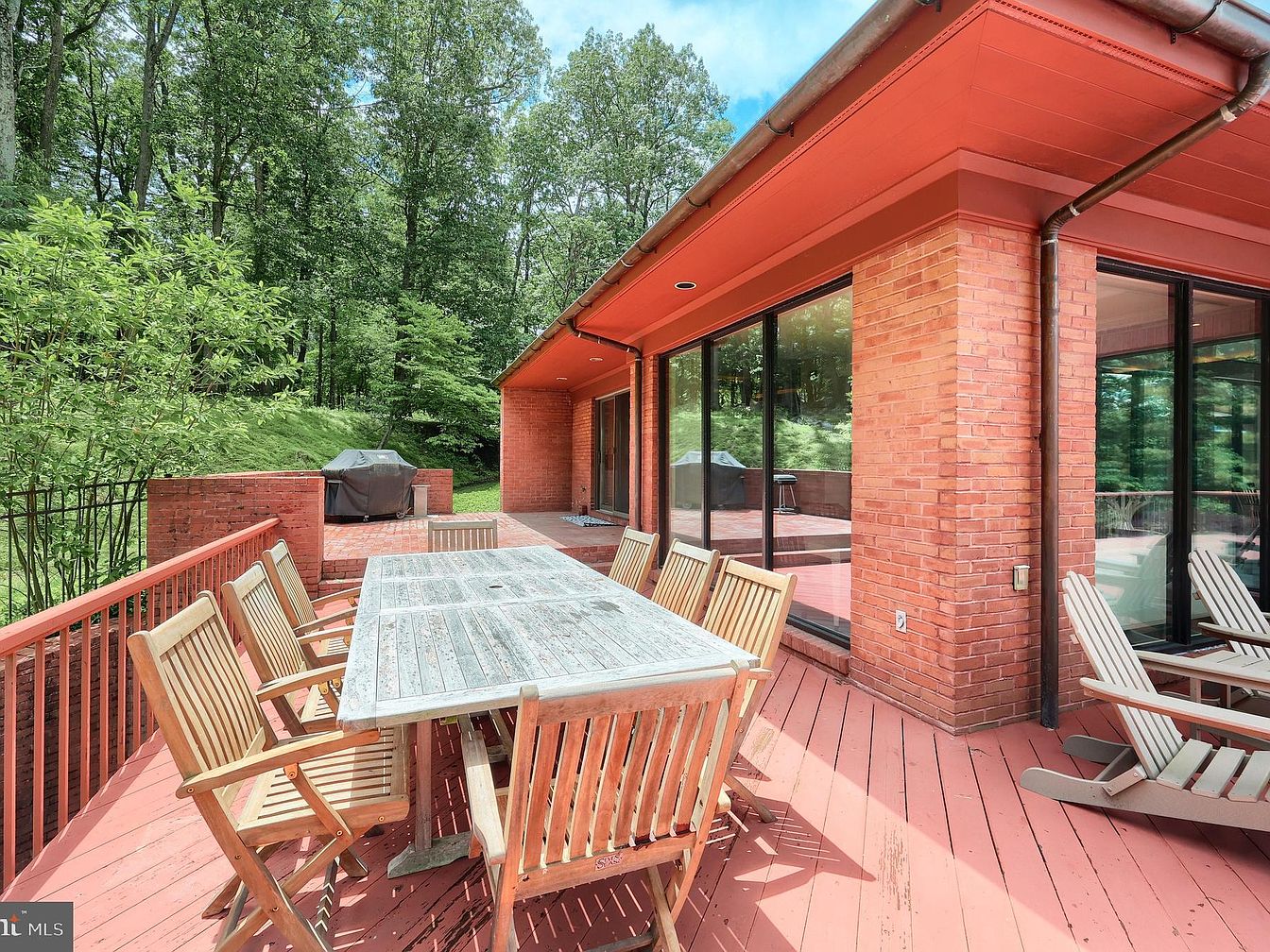 This outdoor deck area features a spacious red-painted wood floor extending around a brick-clad corner of the home. Large sliding glass doors provide seamless indoor-outdoor flow and ample natural light. A rustic wooden dining table surrounded by six matching chairs occupies the forefront, ideal for alfresco meals and gatherings. To the left, a built-in brick enclosure houses a covered grill, perfect for barbecues. Two Adirondack-style lounge chairs are placed near the sliding doors for relaxation. The surrounding lush greenery and towering trees add privacy and a tranquil natural backdrop to this inviting outdoor living space.