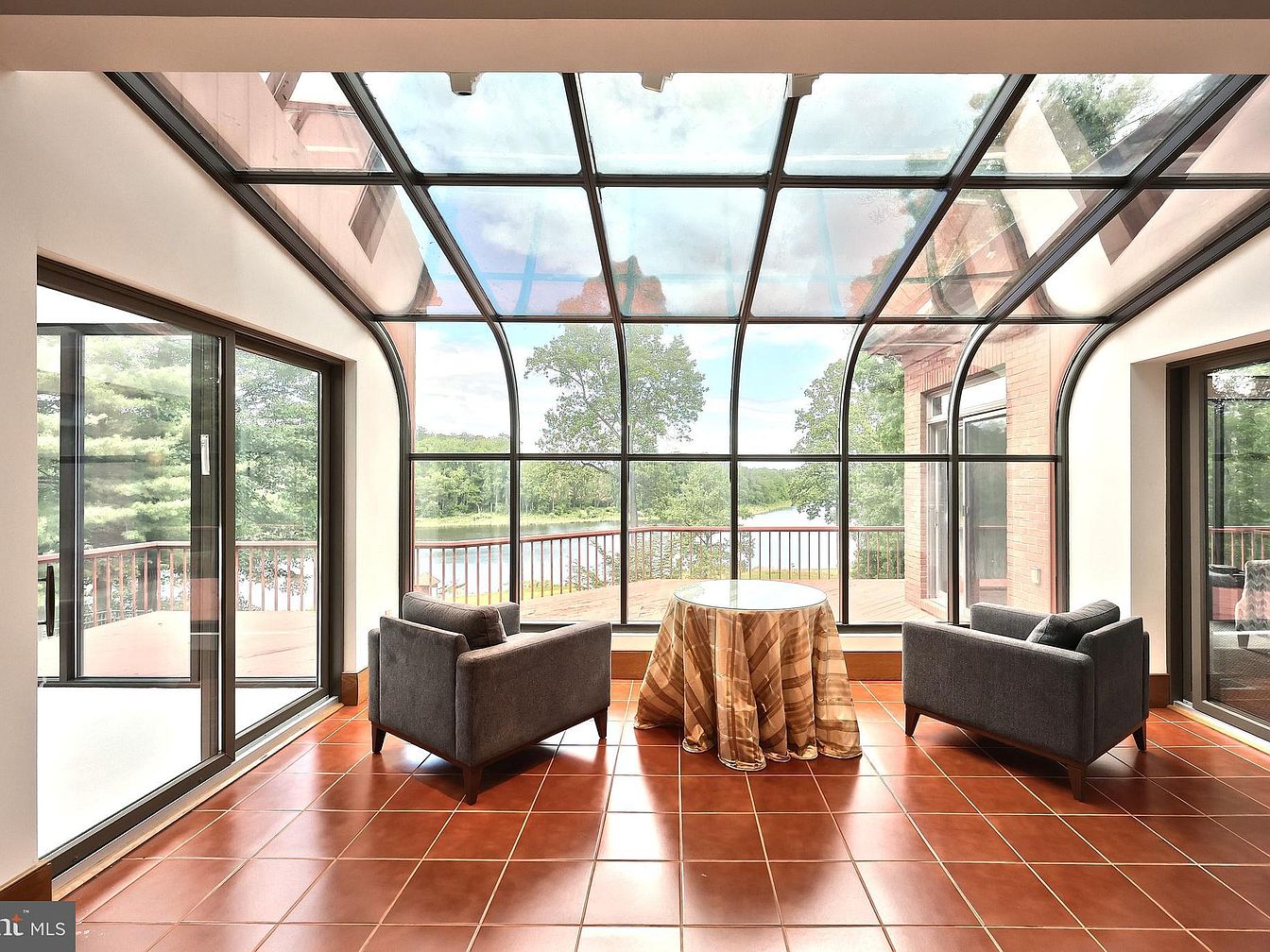 This inviting sunroom is designed as a relaxing transitional space between indoor living and nature. It features expansive curved glass walls and ceiling that maximize natural light and provide an unobstructed view of the outdoor deck and lush greenery beyond. The terra cotta tile flooring adds warmth with earthy tones complementing the neutral walls. Two modern charcoal-gray armchairs frame a small round table draped in a soft, patterned cloth, establishing a cozy seating area perfect for quiet conversation or morning coffee. Sliding glass doors on either side open to the deck, enhancing airflow and indoor-outdoor flow.