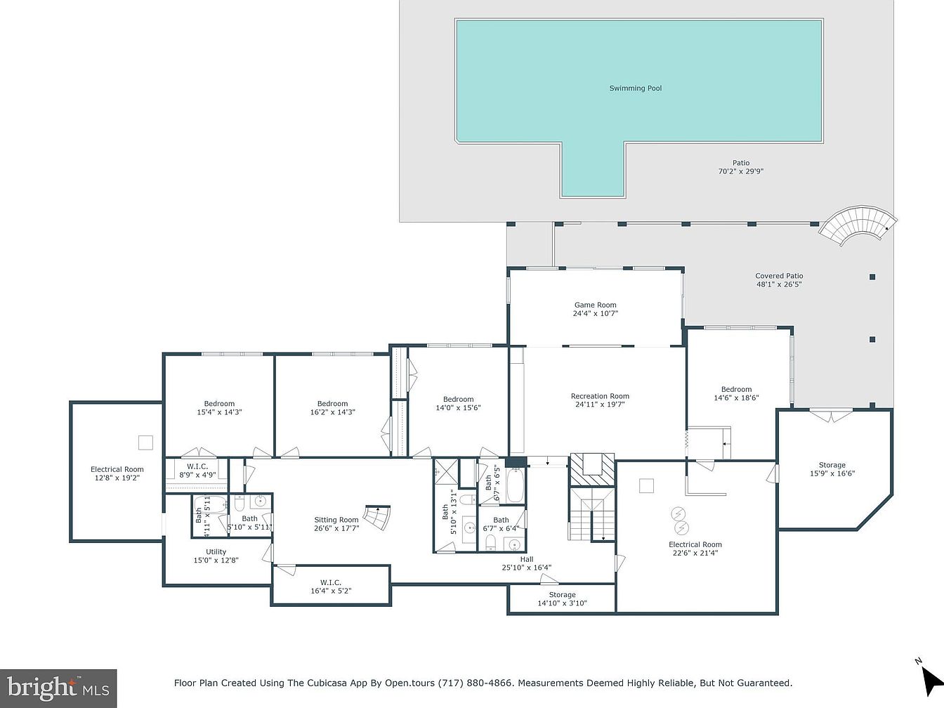 This spacious basement layout includes multiple bedrooms, a sitting room, and dedicated utility spaces. Four bedrooms provide ample living quarters, with two walk-in closets enhancing storage solutions. The sitting room anchors the space with a generous 26’6” by 17’7” footprint, ideal for relaxation or informal gatherings. Recreational facilities are abundant, featuring a large recreation room connected to a game room, perfect for entertainment. Two electrical rooms and additional storage areas provide practical utility. The basement also has multiple bathrooms, ensuring convenience. Outside, a vast covered patio leads to a large swimming pool, blending indoor comfort with outdoor leisure effortlessly.