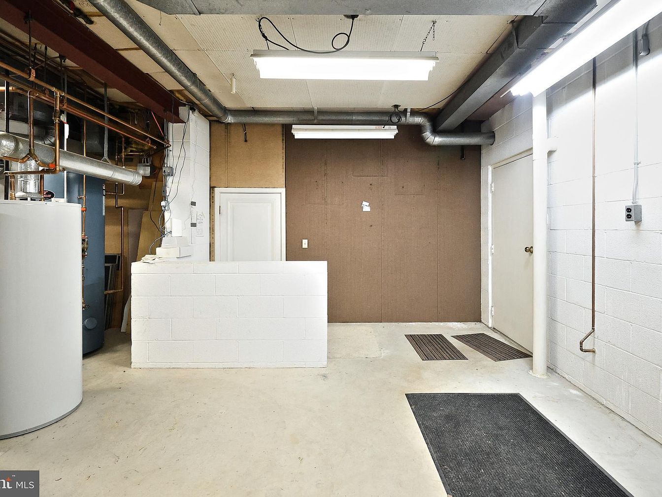 This basement utility area presents a clean, functional space primarily finished with cinder block walls painted white, complemented by a section of brown paneling that adds contrast. Exposed pipes and ductwork run along the ceiling and walls, emphasizing the raw, industrial aesthetic. There are two white doors on the far wall, conceivably leading to storage or mechanical rooms. Fluorescent tube lighting fixtures mounted on the ceiling provide bright, even illumination. The floor is a smooth concrete surface with dark floor mats arranged strategically, underscoring the utilitarian purpose of the area. Overall, it’s a practical and well-maintained space focused on household systems and storage.