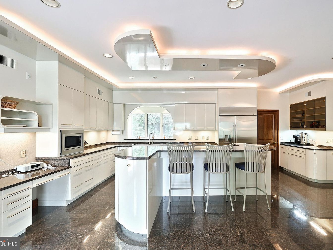This kitchen features a sleek, modern design highlighted by glossy white cabinetry with clean, minimalist hardware. The L-shaped layout maximizes countertop space, topped with dark granite surfaces that contrast beautifully against the bright cabinets. A large island serves as both a workspace and casual dining area, equipped with three contemporary metal bar stools with navy cushions. Recessed lighting and an artistic ceiling detail with integrated LED strips create a warm, inviting ambiance. Stainless steel appliances, including a double-door fridge and built-in microwave, blend seamlessly into the design. An arched window adds architectural interest and brings natural light into the space.