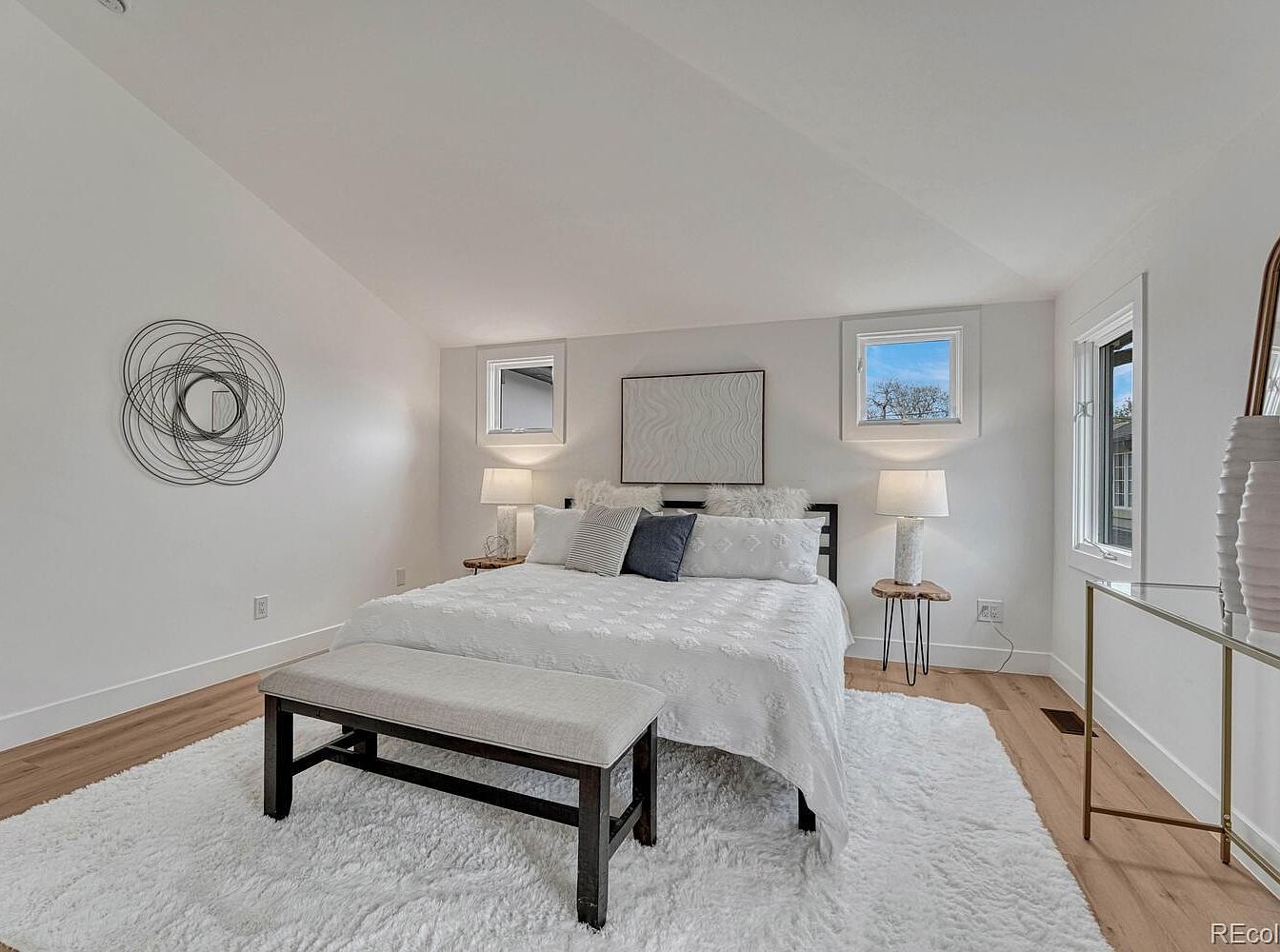 This serene bedroom features a vaulted ceiling that enhances the spacious and airy feel. The walls are painted in a soothing light gray tone that complements the natural wood floors. A large white area rug softens the room, adding warmth and texture beneath the dark wood bed frame, which is dressed in a white quilt with subtle patterns. An upholstered bench sits at the foot of the bed. On either side, natural wood nightstands hold simple lamps with white shades, framed by two small windows letting in natural light. Decorative elements include a minimalist circular wire wall art and a glass console with vases, contributing to the modern, clean-lined aesthetic.