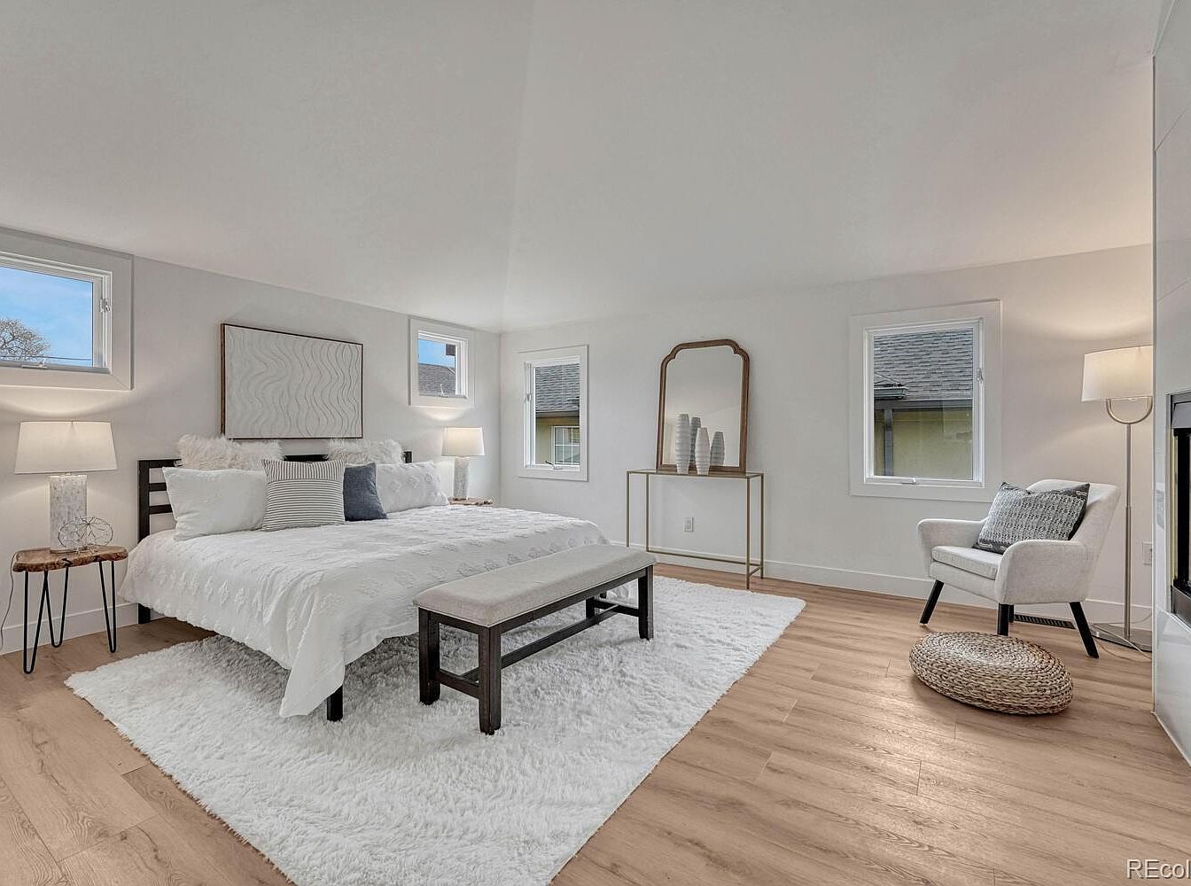 This spacious master bedroom exudes a calm and inviting atmosphere with its predominantly white and neutral color scheme. The room features light wood flooring that complements the white walls and ceiling, creating a bright, airy space. A large bed dominates the room, dressed in crisp white bedding layered with various pillows for texture. Flanking it are two bedside tables with modern lamps, adding warmth and soft lighting. At the foot of the bed, a simple wooden bench with an upholstered cushion provides seating. A plush white rug defines the sleeping area, adding coziness. On one side, a sleek console table with a decorative mirror and vases offers minimalist elegance, while a comfortable armchair with a patterned cushion creates a cozy reading nook next to a tall floor lamp, enhancing the room’s functionality and style.