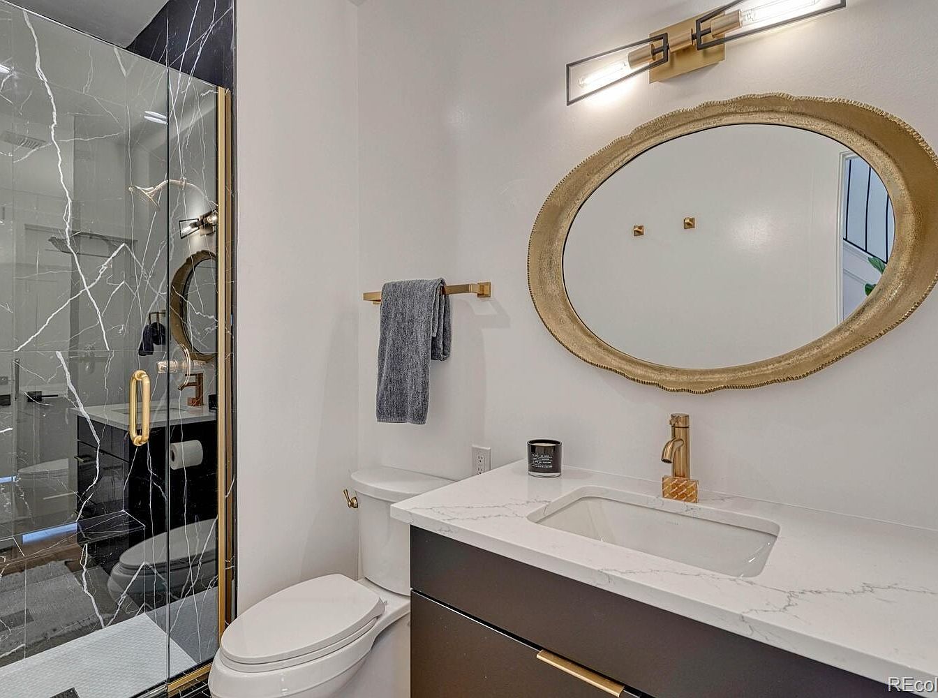 This bathroom features a modern, clean design with a monochrome palette accented by gold fixtures. The vanity has a sleek black cabinet with a polished white marble countertop seamlessly integrated with a rectangular under-mount sink. Above the sink, a large, rustic gold-framed oval mirror adds texture and warmth. The gold faucet and matching hardware complement the towel bar and light fixture, which emits soft, warm light. To the side, a stylish black marble shower enclosure with white veining is enclosed by clear glass with gold trim, enhancing the luxurious feel of the space.