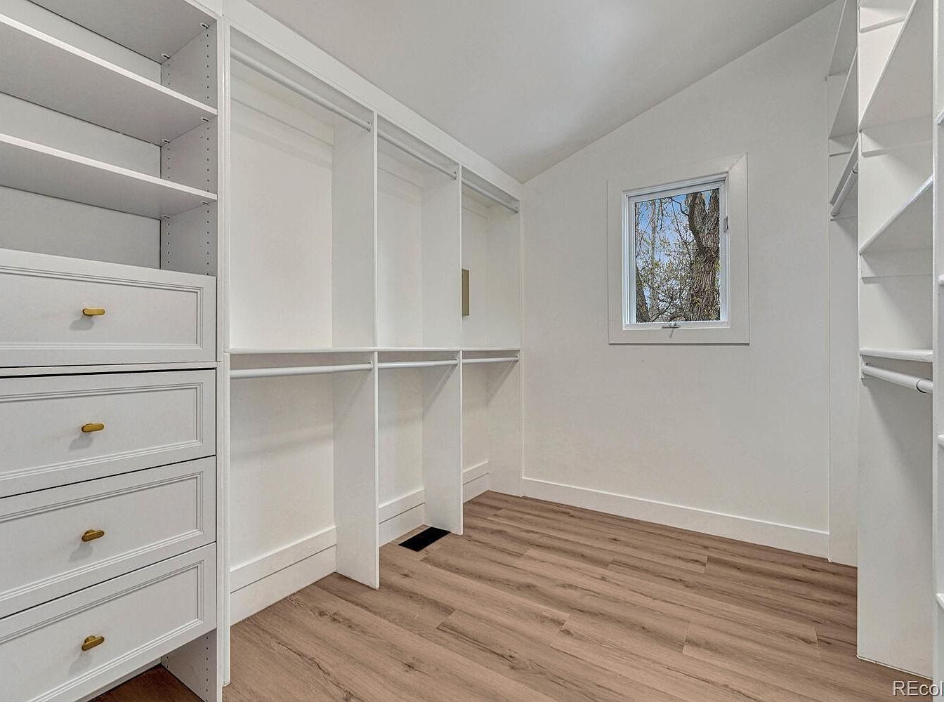 This spacious walk-in closet features an efficient, built-in storage system with multiple open shelving units, hanging rods, and four drawers with brass handles. The white cabinetry contrasts with the light, natural wood-tone flooring, creating a bright and clean aesthetic. A single, small window on the far wall introduces natural light, revealing views of a tree outside and adding an airy element to the otherwise minimalist space. The layout maximizes organization potential, offering ample room for clothing and accessories, while maintaining a sleek, contemporary, and functional design.