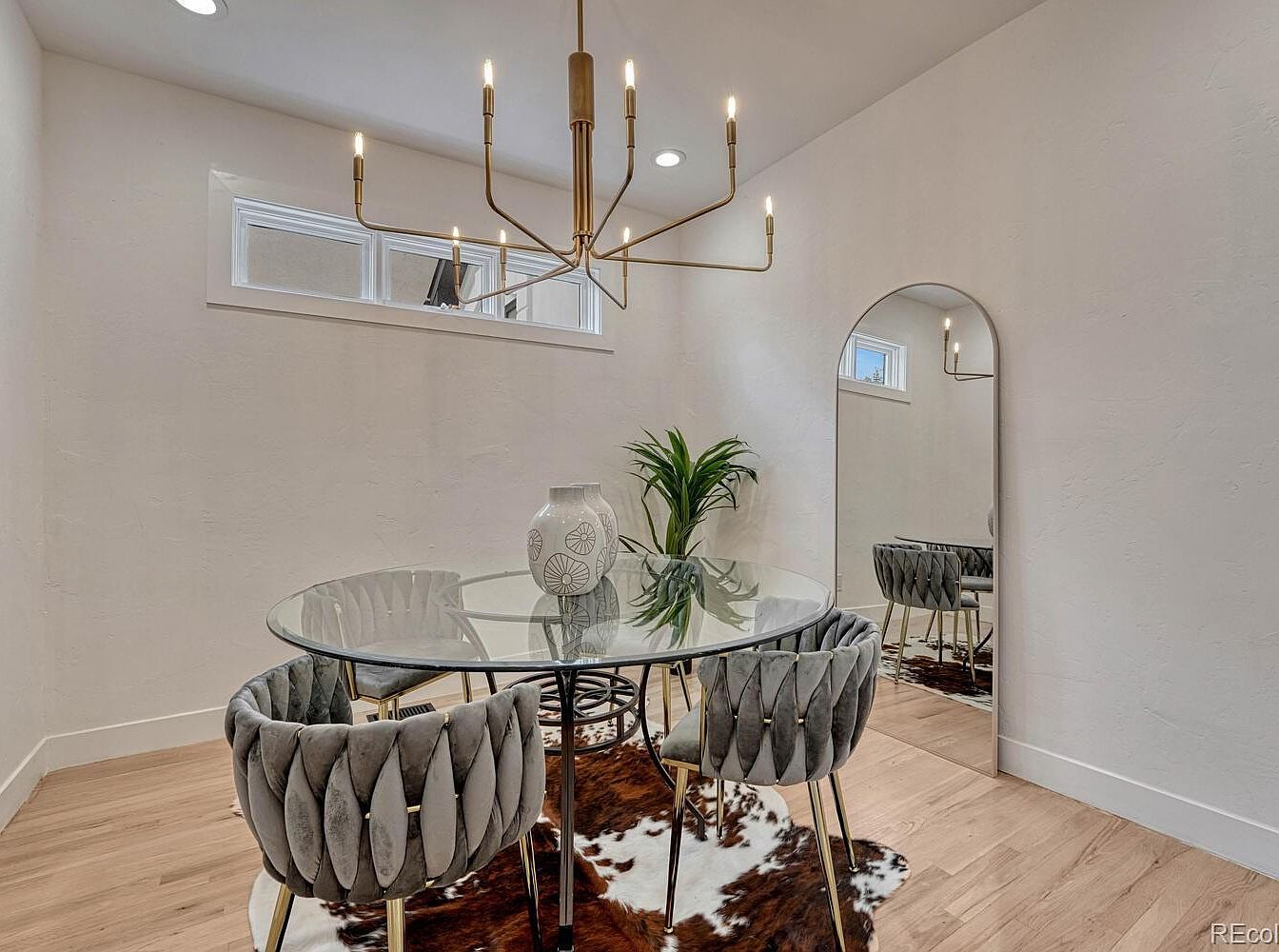 This dining nook features a modern, minimalist design with clean lines and a serene color palette. The round glass table with a sleek metal base is complemented by four plush, grey velvet chairs that offer comfort and elegance. A unique, gold-toned chandelier with multiple arms and exposed bulbs adds an artistic touch while softly illuminating the space. Light hardwood flooring grounds the area and contrasts with a cowhide rug beneath the table, bringing warmth and texture. A tall, arched mirror against the wall enhances the room’s openness, while a potted plant adds a fresh natural element.
