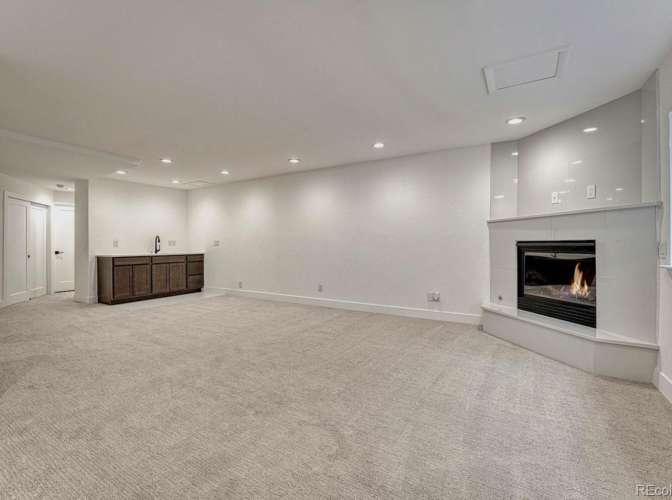 This spacious basement living area features a neutral color palette with soft beige carpeting that extends wall-to-wall, complementing the warm, white walls. Recessed ceiling lights provide a clean, modern look and ample illumination. A sleek, built-in fireplace with a glossy white surround adds a focal point and cozy ambiance to the room. On one side, a dark wood wet bar with a small sink creates convenient functionality while subtly contrasting against the light tones. White baseboards and minimalist trim complete the understated, contemporary design, offering a versatile space ideal for relaxation or entertaining.
