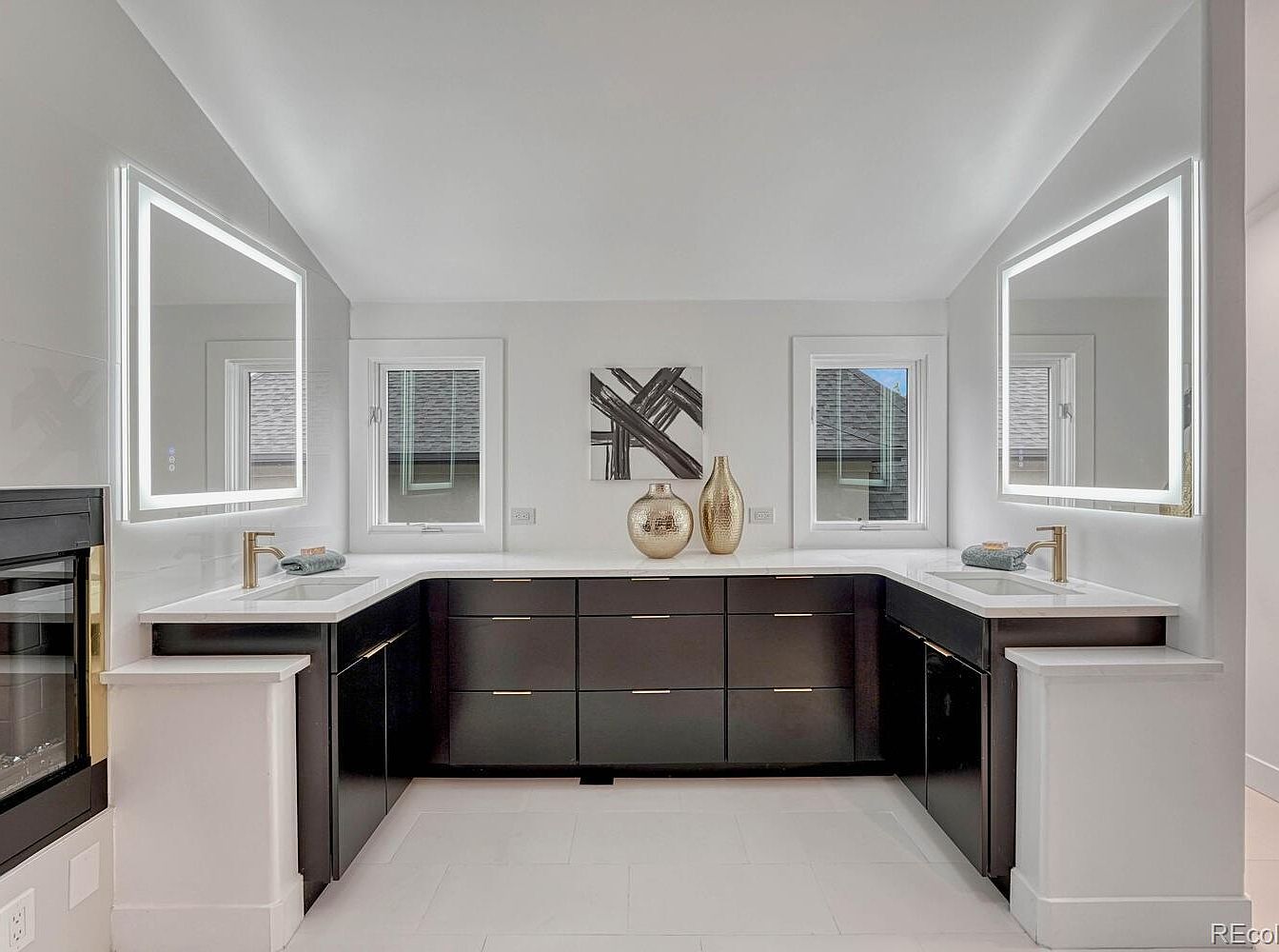 This bathroom features a sleek double vanity with clean lines and a monochromatic color scheme emphasizing black and white contrasts. The cabinetry is matte black with subtle gold-toned horizontal handles, topped by crisp white countertops hosting two under-mount sinks. Above each sink, large rectangular mirrors have integrated LED lighting, creating a bright and modern ambiance. Two narrow windows flank a central wall adorned with minimalist abstract art and two gold decorative vases, adding sophistication and warmth to the otherwise cool space. The white floor tiles and light walls enhance the airy, spacious feel.