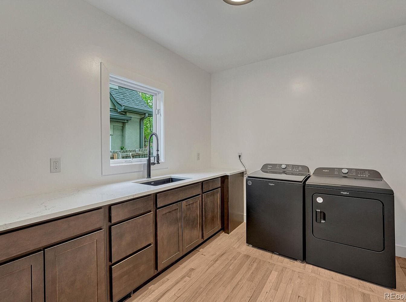 This laundry room combines functionality and simplicity with a modern aesthetic. It features a clean, bright space with white walls and light-toned wood flooring that brightens the room. Dark cabinetry runs along one wall, topped with a white countertop that houses a sleek black undermount sink and modern black faucet. To the right are a matching black washing machine and dryer set, complementary in style and color to the cabinetry. A small window above the sink allows natural light to filter through, enhancing the fresh and efficient atmosphere of the space.