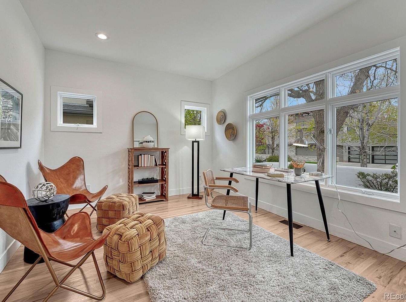This cozy home office nook features a large, bright window wall framing views of mature trees and a neighborhood street, flooding the space with natural light. The decor embraces a neutral palette with light wood floors and white walls, enhancing openness. Furnished with a slim, modern desk topped with a marble surface and supported by slender black metal legs, it encourages minimalistic elegance. A woven chair complements the desk while two caramel leather butterfly chairs and cushioned poufs create a casual seating area. Additional touches include a tall floor lamp, a small carved wood bookshelf with mirror, and woven basket wall art, contributing to a warm, contemporary feel.