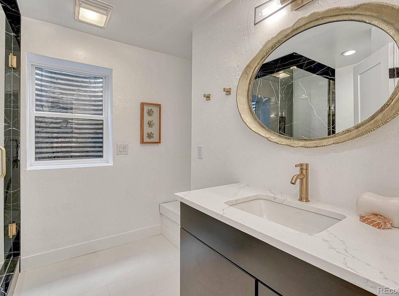 This bathroom showcases a sleek design with a modern, clean aesthetic. The vanity features a white marble countertop with subtle gray veining, complemented by a matte black cabinet offering ample storage. A brushed gold faucet adds a warm, luxurious touch, mirrored by the oval framed mirror with an equally elegant gold border. Light beige textured walls provide a subtle contrast, enhancing the brightness of the space. The large window permits natural light but is secured with a corrugated metal exterior well. A small shadow box with botanical elements adds understated decorative flair to the otherwise minimalist room.