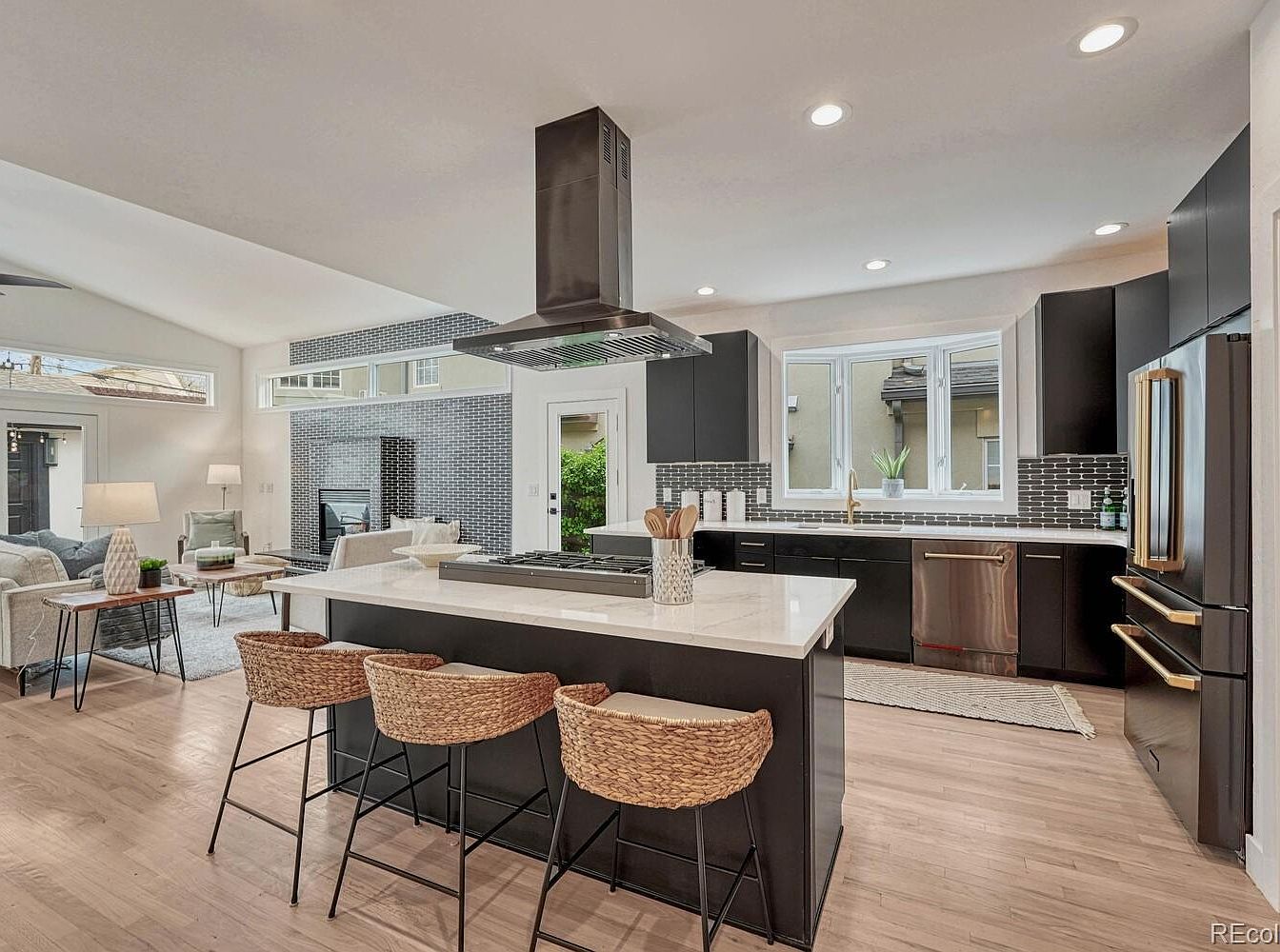 This spacious open-concept kitchen and living area features a clean, modern design with a harmonious balance of dark cabinetry and light surfaces. The kitchen boasts sleek black lower and upper cabinets paired with a white marble island countertop, creating a striking contrast. Natural woven bar stools add warmth and texture at the island. Stainless steel appliances and a stainless range hood bring a contemporary touch. Subtle greenish-gray subway tiles form a backsplash, complementing the neutral tones. Beyond the kitchen, the living room includes light-toned seating and natural-wood furniture, centered around a stylish gray fireplace wall, allowing for a seamless flow between cooking and relaxation spaces.