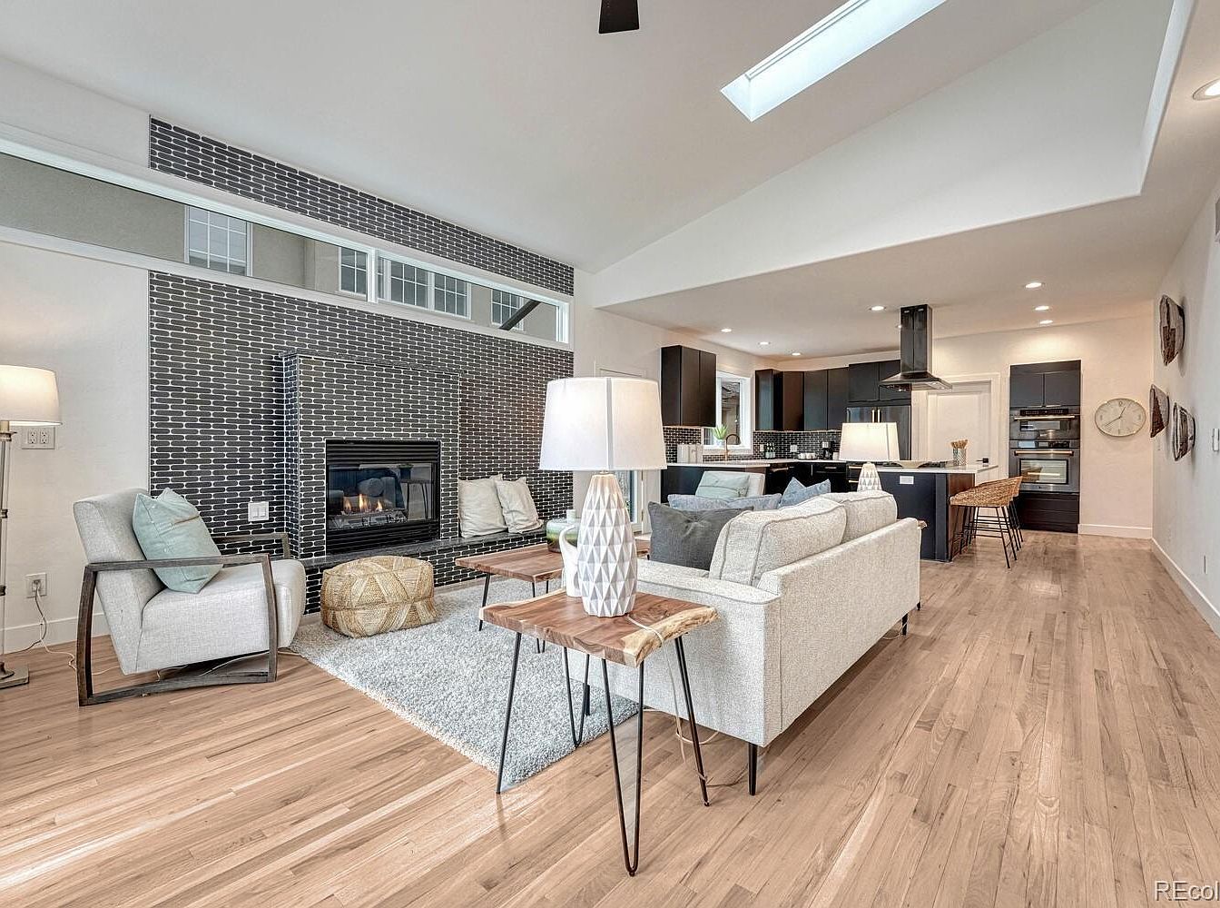 This open-concept living area combines a modern living room and kitchen in a spacious, airy layout. The living room features a light gray sofa paired with a matching armchair and soft cushions. A textured area rug complements the light hardwood floors, adding warmth and comfort. The focal point is the dark brick fireplace wall that contrasts elegantly against the neutral tones, topped with a narrow horizontal window for added natural light. The kitchen in the background showcases sleek black cabinetry with a matching island, stainless steel appliances, and contemporary lighting, maintaining a cohesive monochromatic and minimalist aesthetic throughout.