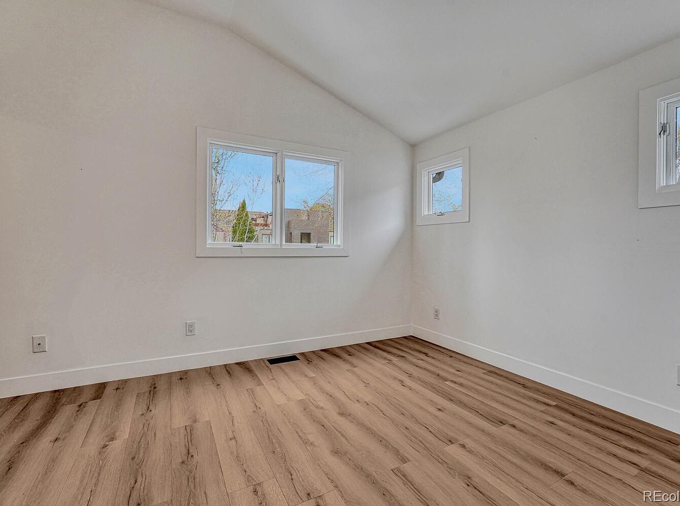 This bright corner of a bedroom features a minimalist design with clean, white walls and contrasting warm wood flooring. The vaulted ceiling enhances the airy feel, while three windows—one large and two smaller—allow natural light to flood the space, offering a view of trees and neighboring buildings. Simple white trim frames the windows and baseboards, maintaining a fresh and contemporary aesthetic. The floor vent and electrical outlets are neatly integrated, suggesting thoughtful attention to functionality alongside the room’s calm, modern simplicity.