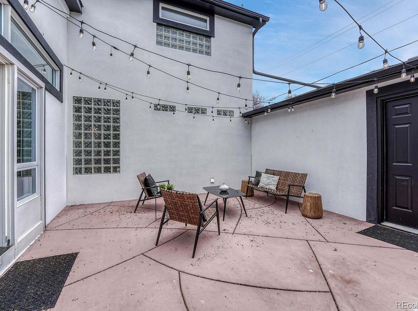 This cozy outdoor patio offers a private, enclosed space perfect for relaxing or entertaining. The concrete floor features geometric sections that add subtle architectural interest. Walls are painted a clean, light gray, contrasted by black trim around a door and windows, creating a modern monochromatic palette. Glass block windows allow natural light to enter while maintaining privacy. String lights suspended overhead add a warm ambiance for evening gatherings. Woven lounge chairs and a matching loveseat are arranged around a sleek black coffee table, complemented by accent cushions and a small woven side table, enhancing comfort and style.