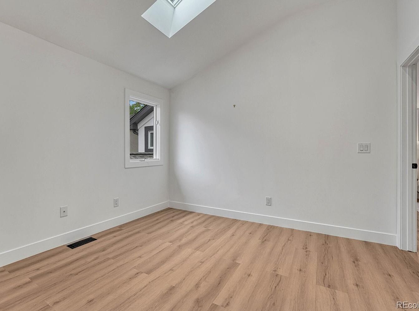 This cozy room corner features a simple, clean layout highlighted by soft white walls which create an airy and bright atmosphere. The medium-tone wood laminate flooring adds warmth and texture, balancing the crispness of the walls. A modestly sized window brings in natural light and offers a glimpse of an exterior roofline, enhancing the room’s openness. The white trimmed baseboards and door frame maintain a crisp, modern finish. The vaulted ceiling is enriched by a skylight, further amplifying daylight and adding architectural interest to this minimalist, inviting space perfect for a small bedroom or office nook.