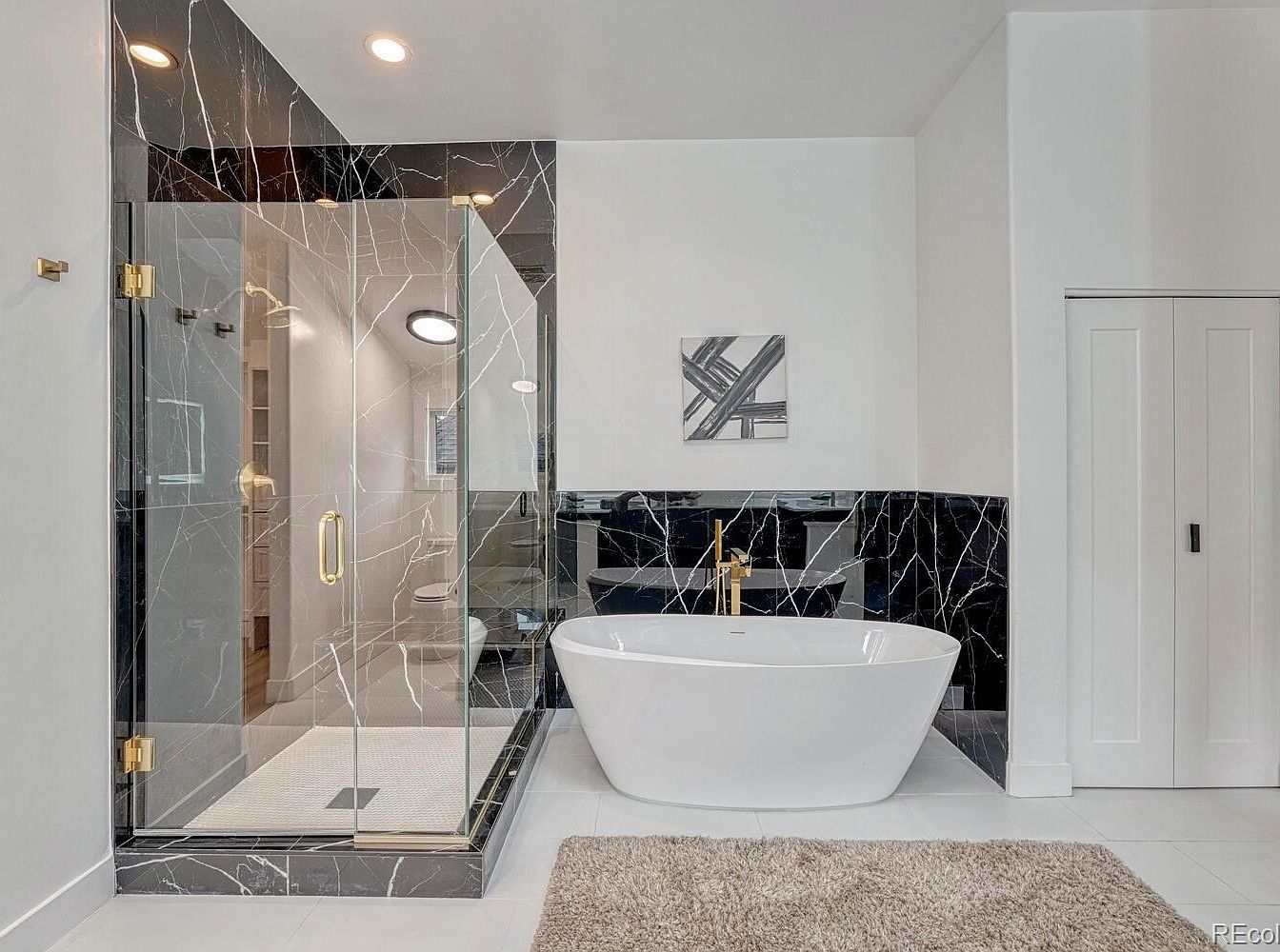 This bathroom exudes a sleek, contemporary charm with a striking contrast between black marble with white veining and crisp white surfaces. The spacious glass-enclosed shower features matching black marble walls and gold fixtures, creating an elegant focal point. Adjacent is a smooth, freestanding white bathtub with a modern gold floor-mounted faucet, enhancing the luxurious feel. Soft, neutral-toned carpeting adds warmth underfoot, complementing the minimalist design. The room offers clean lines, high ceilings, and a simple monochrome abstract artwork mounted above the tub, emphasizing a refined yet inviting atmosphere.