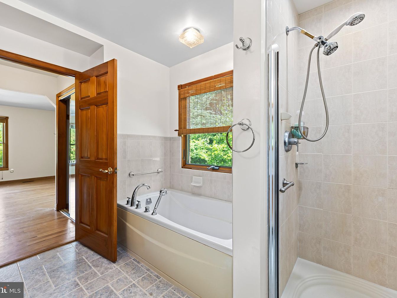 This bathroom features a practical yet inviting layout with a combination bathtub and separate shower stall. The tub area is complemented by neutral beige tiles that extend halfway up the walls, creating a subtle contrast against the white upper walls and ceiling. A medium wood-framed window with woven blinds adds warmth and natural light, while chrome fixtures including a faucet, shower handle, and towel ring, offer a sleek metallic touch. The open wooden door connects the bathroom to a room with hardwood flooring, enhancing a cozy, classic aesthetic blended with modern bathroom conveniences.