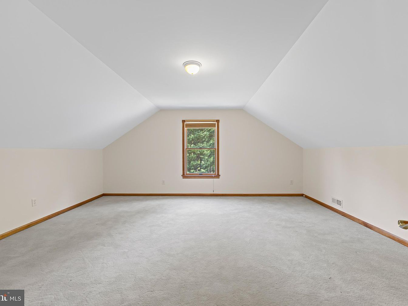 This spacious bonus room is positioned under a sloped ceiling, indicating it’s likely located on the upper level or attic space of the home. The room features neutral beige walls paired with white ceilings, creating a bright and calming atmosphere. Natural wood trim around the window, baseboards, and floor vent adds warmth and subtle contrast. A single window centered on the far wall provides a view of lush greenery outside, allowing natural light to gently fill the space. The light gray carpet softens the floor, making this versatile room perfect for an office, playroom, or additional bedroom. Simple, clean, and inviting.