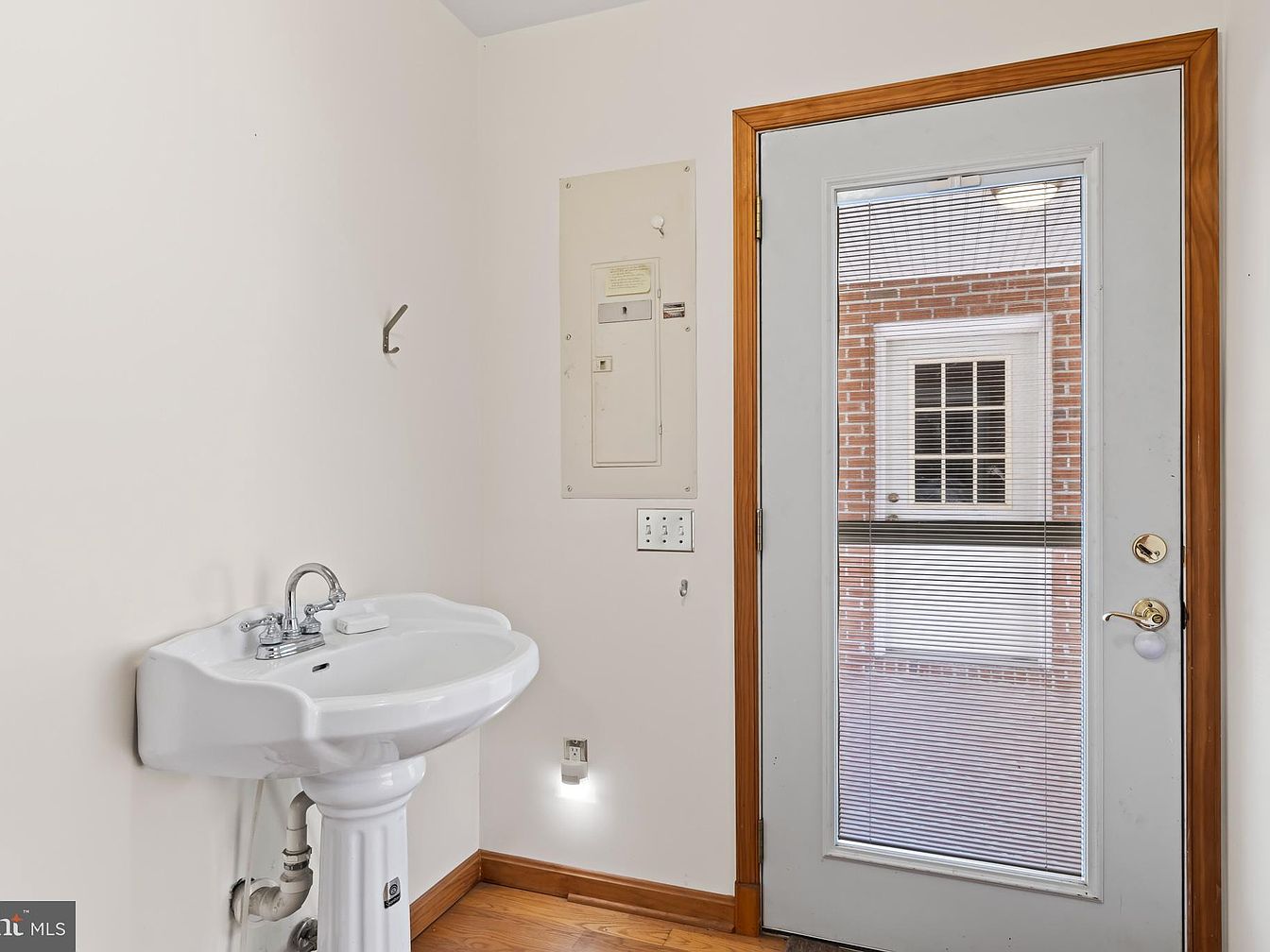 This compact utility area features a clean and simple aesthetic with white walls and light wood trim around the door and baseboards, complementing the warm wooden floor. A white pedestal sink with a classic design is mounted on one wall, accompanied by a small soap dish resting on the basin, providing functionality while maintaining a minimalist look. Adjacent to the sink is an electrical panel and light switch, subtly integrated into the space. The door, framed in natural wood, includes a large glass pane fitted with built-in blinds, allowing for both privacy and natural light, while offering a view of the brick exterior and an adjoining door beyond.