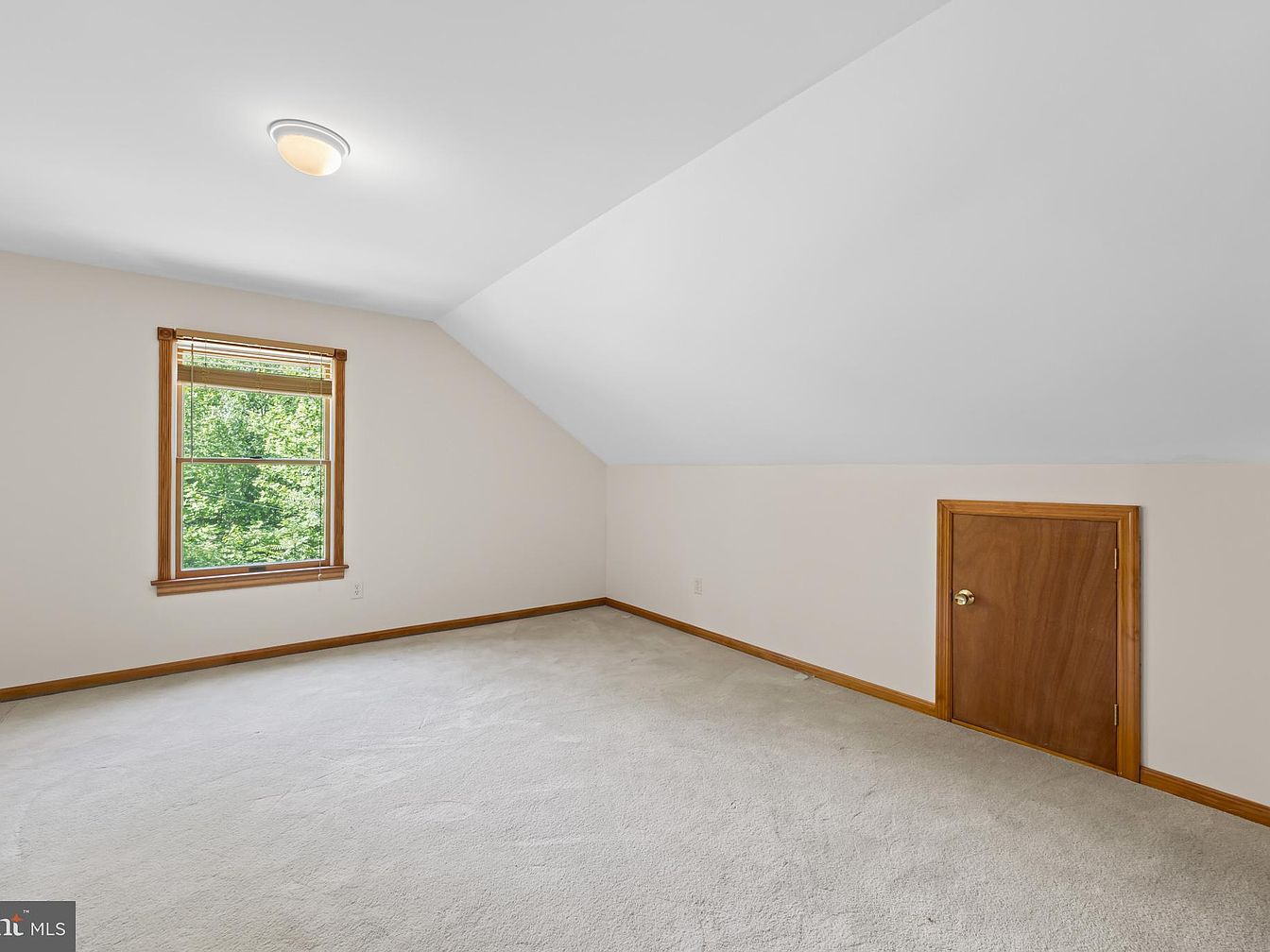 This cozy attic nook features a sloped ceiling that adds architectural interest and charm. Walls are painted a soft beige with crisp white trim along the ceiling, creating a bright and inviting atmosphere. The medium wood trim around the single window and small door contrasts warmly with the neutral walls and carpet. Natural light streams through the window, overlooking lush greenery outside, enhancing the tranquil feel. The small wooden door on one wall suggests additional storage space tucked under the eaves. This quiet corner offers potential for a restful retreat or a quaint workspace.