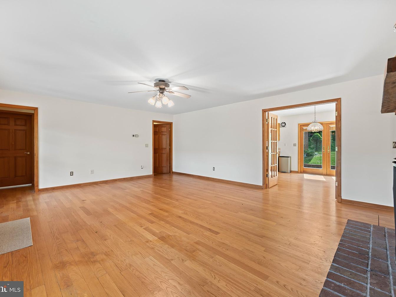 This spacious living room features warm honey-toned hardwood flooring that extends into an adjacent sunroom visible through a wide doorway with glass-paneled double doors. The walls are painted a clean, bright white that enhances natural light. The room includes classic wooden doors and trim with a rich, medium wood finish framing each entry. A ceiling fan with multiple lights hangs from a smooth white ceiling, offering both functionality and subtle style. To the right, a brick fireplace hearth adds rustic charm. The adjoining sunroom with large glass doors opens to a green outdoor space, inviting nature inside.