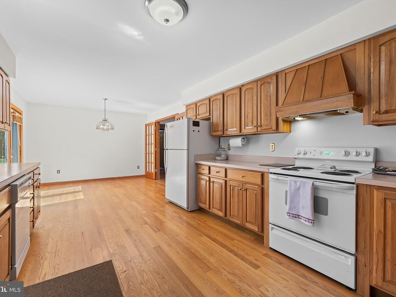This kitchen offers a spacious, open layout blending cooking and casual dining. Natural wood cabinetry with a classic design lines one wall, complemented by matching wood trim around the window and doors. The counters are simple, with a muted pinkish-beige tone that contrasts lightly with the white appliances, including a stove, refrigerator, and dishwasher. The floor is warm-toned hardwood, extending into the adjoining dining space illuminated by a decorative hanging light fixture. White walls and ceiling create a bright, airy feeling while the wooden accents provide a cozy, timeless atmosphere. French doors lead to another room, enhancing flow and connectivity.