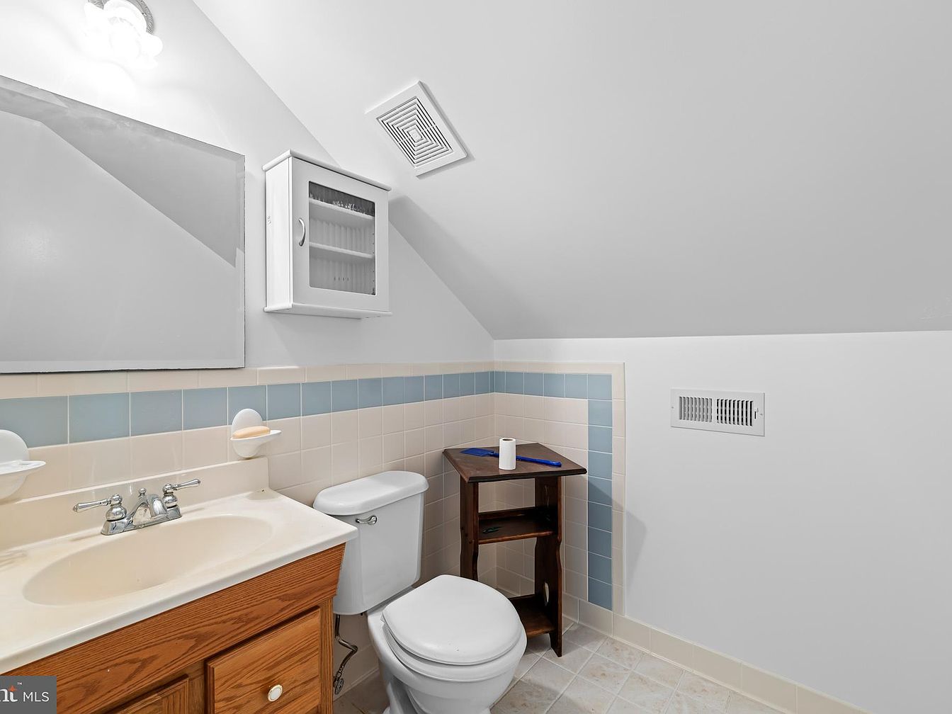 This cozy bathroom corner features a white toilet and a wooden vanity with a cream countertop and integrated sink. The walls are adorned with a two-tone tile border in soft beige and light blue, adding subtle color against the predominantly white walls and ceiling. A small wooden side table fits neatly next to the toilet, holding a roll of toilet paper and other items. Above the vanity, a large frameless mirror reflects the upper wall light fixture, while a white, wall-mounted medicine cabinet with a ribbed glass door provides storage. The slanted ceiling and floor vent enhance the compact, practical layout.