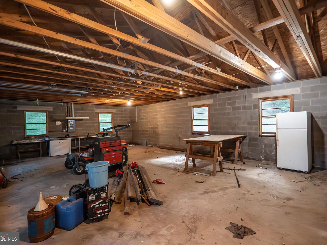 This spacious basement is designed as a practical workshop and storage area, featuring exposed wooden ceiling beams and unfinished concrete block walls. Natural light enters through four small windows framed in wood, adding subtle warmth to the otherwise rustic and utilitarian space. The floor is bare concrete, showing signs of use and dust, emphasizing the room’s function over form. A white refrigerator stands along one wall next to a large, simple wooden worktable supported by sawhorses. Scattered tools, equipment, and storage bins suggest an active workspace awaiting further organization or completion.
