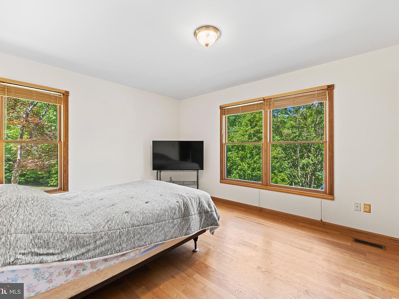 This peaceful bedroom corner features warm wooden floors and matching window trims that invite natural light to fill the space. The walls are painted a soft white, enhancing the room’s airy and bright ambiance. Two large windows showcase lush, green outdoor views, providing a calming connection to nature. A simple bed with a gray comforter occupies the foreground, balancing functionality with minimalism. A sleek, flat-screen TV is positioned on a modern metal stand near the far wall, confirming the room’s practical, yet serene aesthetic. The overall feeling is one of understated comfort and natural tranquility.