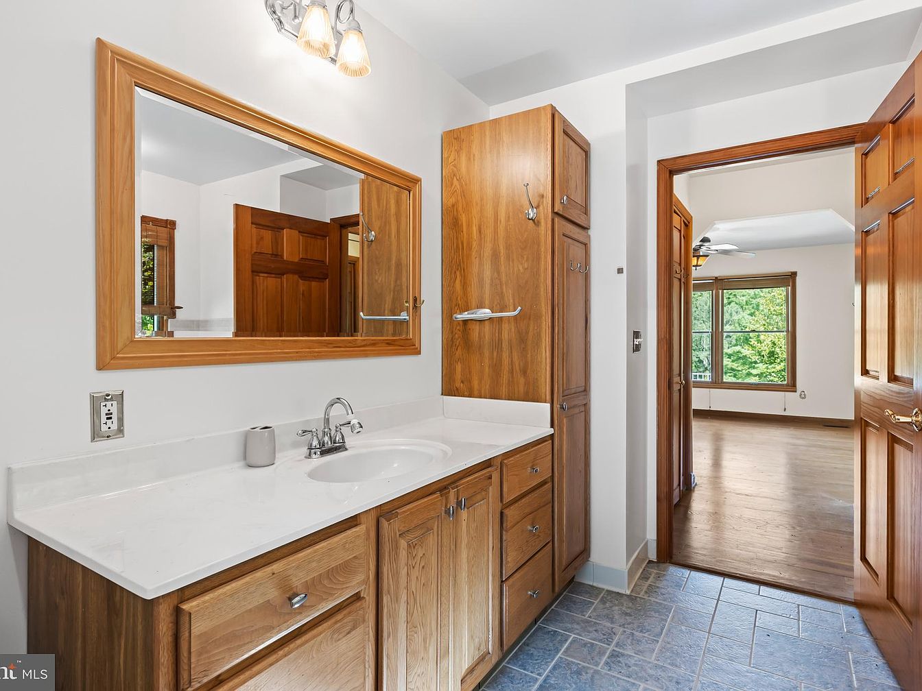 This bathroom area features a spacious vanity with a white quartz countertop and an undermount sink. The cabinetry is crafted from warm-toned wood, providing a natural and cozy atmosphere. Above the vanity, a large rectangular mirror framed with matching wood enhances the sense of space and light. A double-light wall sconce sits above the mirror for bright, even lighting. The flooring consists of blue-gray textured tiles laid in a staggered pattern, blending well with the neutral white walls. A tall wood linen cabinet offers ample storage, and an open door reveals a connected room with wood floors and large windows showcasing greenery outside.