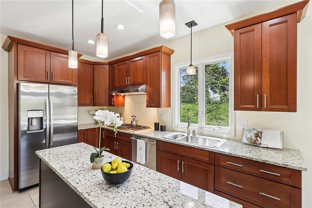 This kitchen features a warm, inviting design with rich, cherry wood cabinetry that lines the walls and frames the large stainless steel refrigerator. A spacious island with a speckled granite countertop sits centrally, adorned with a simple black bowl filled with green apples and a small potted orchid adding a touch of freshness. The countertops, matching the island, extend beneath a bright window that overlooks lush greenery, inviting natural light inside. Three pendant lights hang over the island and sink area, providing soft, warm illumination. Stainless steel appliances and modern hardware complete the elegant yet functional space.