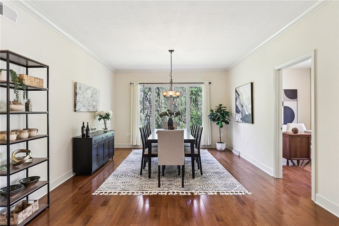 This elegant dining room features warm hardwood floors that complement the soft, neutral wall color, creating a bright and inviting atmosphere. A large, patterned area rug anchors the black dining table and chairs, with two upholstered end chairs adding a touch of comfort and sophistication. The room is balanced with a black sideboard against one wall, decorated with minimalistic floral arrangements and wine bottles, while an industrial-style open shelving unit displays tasteful pottery and greenery. Natural light pours in through wide windows dressed with light curtains, enhancing the open, airy feel. A modern chandelier hangs centrally above the table, and abstract art adds subtle visual interest on the walls. The room connects seamlessly to an adjacent space, visible through a doorway, emphasizing flow and openness.