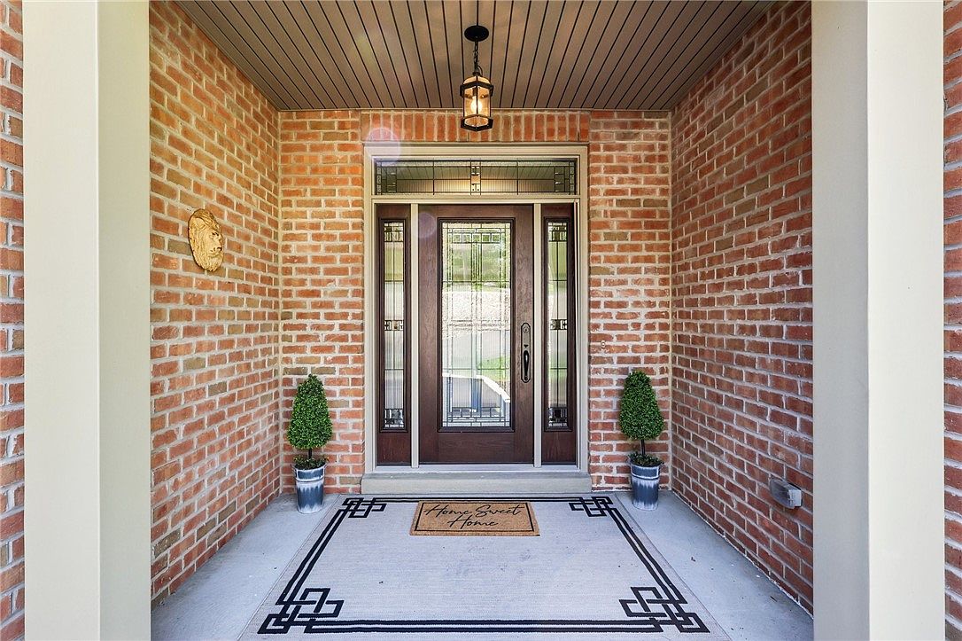 This charming front porch entry embraces a warm, inviting atmosphere with its exposed red brick walls set in a spacious alcove framed by soft beige pillars. The dark wood front door features intricate glass panels bordered by matching sidelights, allowing natural light to filter through while maintaining privacy. Above the door, a decorative transom window enhances the classic elegance. Two small, neatly trimmed potted topiary plants symmetrically flank the entrance, adding greenery and balance. A neutral-toned doormat with “Home Sweet Home” in cursive rests atop a stylish geometric-bordered rug, while a black lantern-style light fixture hangs from a paneled ceiling, completing this welcoming entryway.