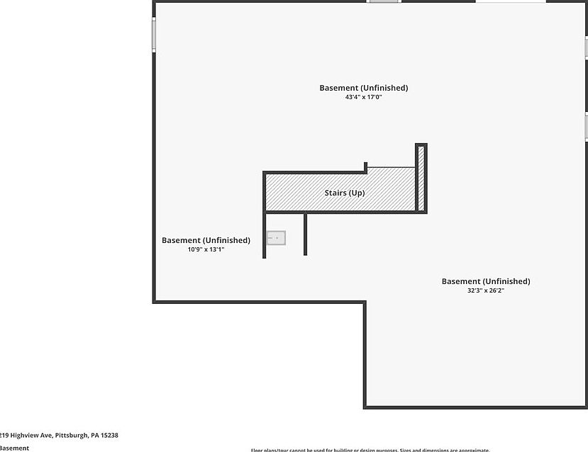This basement plan highlights a spacious unfinished area divided into three sizeable sections, ideal for flexible use and future customization. The staircase is centrally located, offering convenient access from the upper floors, while space beneath the stairs can accommodate utilities or storage. The largest section measures over 43 feet by 17 feet, giving ample room for recreation or storage options. The color scheme is neutral, emphasizing open potential. The clean, simple lines and absence of obstructions create a blank canvas ready to be transformed into a functional or living space to suit various needs.