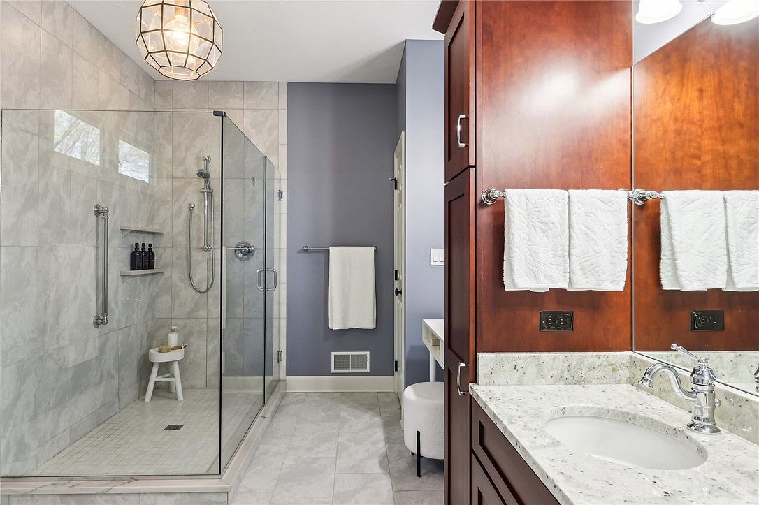 This bathroom features a spacious walk-in shower enclosed by clear glass, showcasing large gray marble tiles that extend from floor to ceiling, blending seamlessly with matching floor tiles. A minimalist white stool and built-in niche with dark bottles add subtle decorative touches. Adjacent to the shower, a light gray wall provides contrast, where a simple towel rack holds a white towel, enhancing the calm atmosphere. The vanity area includes rich wooden cabinetry with warm tones, topped with a light granite countertop and a classic silver faucet. A large mirror with white textured towels elevates the room’s elegance, blending modern design with timeless comfort.