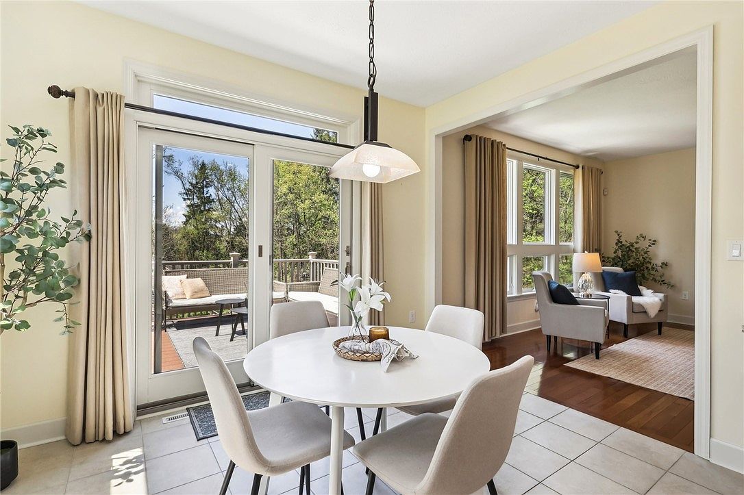 This bright dining area features a round white table surrounded by four light beige upholstered chairs, positioned on a tiled floor. A modern pendant light hangs centered above the table, enhancing the space’s inviting atmosphere. Large sliding glass doors with beige curtains open to a deck with outdoor seating, connecting indoor and outdoor living effortlessly. Adjacent to the dining area, a sitting room with warm wood flooring boasts two gray armchairs, a textured rug, and a lamp on a side table. Tall windows with matching beige drapes fill the room with natural light, while decorative plants add a refreshing touch of greenery throughout.