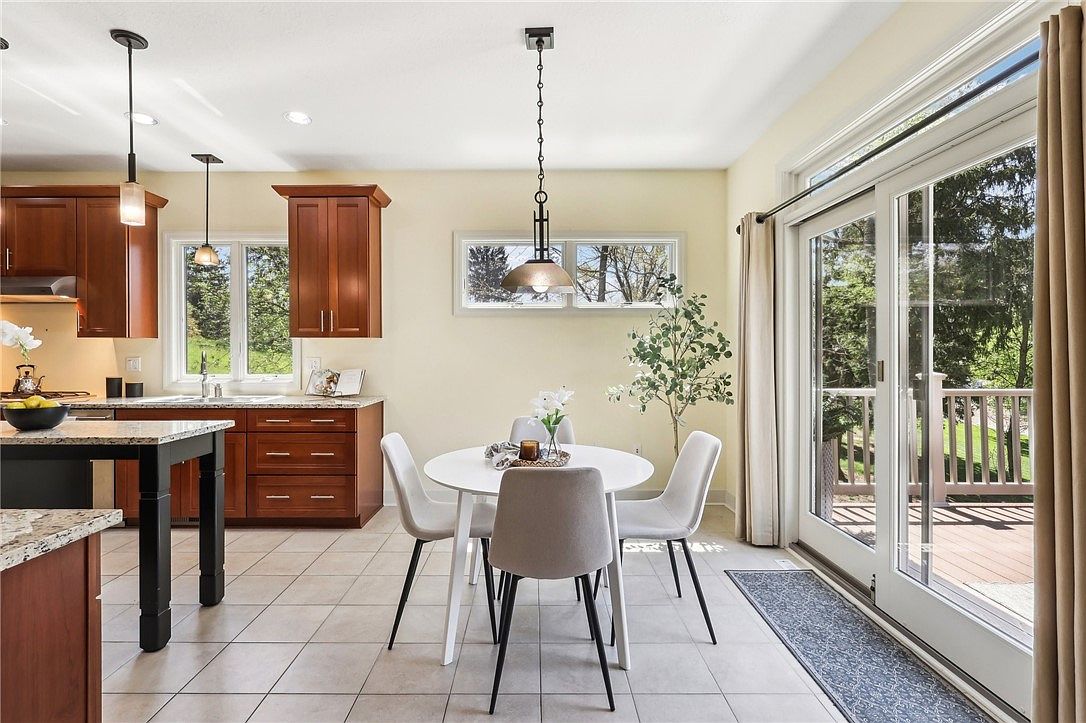 This breakfast nook features a cozy, modern design with a round white table surrounded by four light gray chairs that have slender black legs. Warm, natural light floods the space through large sliding glass doors on the right, leading to a wooden deck outside. Nearby, a tall leafy indoor plant adds a touch of greenery and freshness. The floor is tiled with a neutral beige palette, complementing the creamy wall color. To the left, rich cherry wood cabinetry and granite countertops frame the kitchen area, while pendant lights hang over the breakfast table and kitchen island, enhancing the inviting ambiance.