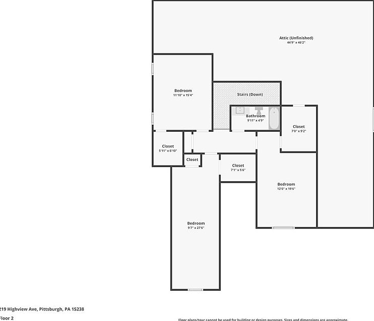 This second-floor layout features three bedrooms, each thoughtfully sized to balance comfort and function, with closets incorporated for storage. The stairway landing leads directly to a compact bathroom with necessary amenities. The bedrooms vary in shape and size, with one notably long room, offering flexible use such as a home office or lounge area. Ample closet space is provided throughout, enhancing organization without compromising room dimensions. An unfinished attic area also borders this level, providing endless possibilities for future expansion or storage. The plan emphasizes careful space allocation and practical flow between rooms.