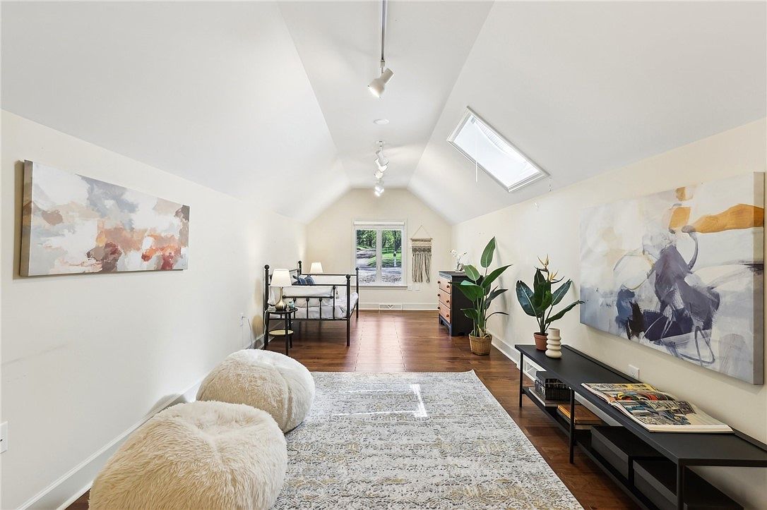 This elongated attic space serves as a tranquil bedroom and lounge area with an angled vaulted ceiling enhanced by recessed track lighting. The natural light flows in through a skylight on the right and a window at the far end, brightening the warm honey-toned hardwood flooring. Soft neutrals dominate the palette, with cream walls paired with plush, off-white faux fur poufs and a large, patterned area rug adding texture and comfort. Black metal furniture, including a simple bed frame, side table, and long, low console, contrasts elegantly with greenery and modern abstract art, creating a balanced, cozy retreat.