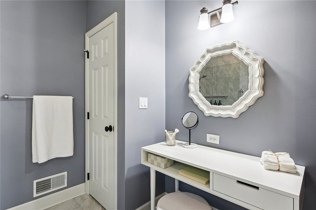 This bathroom corner features a sleek, modern vanity setup with a pristine white desk-style counter accompanied by a cushioned stool for comfortable seating. The wall behind is painted in a soothing light gray shade, creating a calming ambiance. Above the vanity hangs an ornate, scalloped circular mirror with a white frame that adds an elegant, vintage detail. A double-light fixture with frosted glass shades brightens the space. The adjacent wall includes a simple white door, a towel rack with a white towel, and a floor vent. The overall aesthetic combines practicality with subtle sophistication, balancing modern and classic elements.