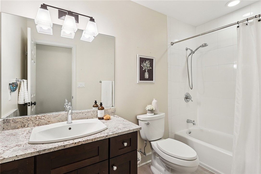 This bathroom features a clean and simple design with a neutral color palette focusing on white and beige tones. The vanity has dark wood cabinetry topped with a light granite countertop, adding a subtle contrast. An undermount sink is paired with a modern chrome faucet. Above the vanity, a large mirror stretches across the wall, framed by contemporary light fixtures with frosted glass shades that provide soft, even illumination. The toilet is positioned beside the bathtub, which is surrounded by white tiled walls and complemented by a white shower curtain on a chrome rod. Minimal decorative elements, including framed art and a small vase, create a fresh and inviting atmosphere.