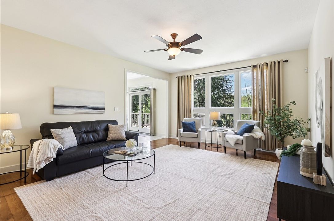 This inviting living area features a harmonious blend of neutral tones, with soft cream walls complementing the warm wooden flooring. A plush, light beige area rug anchors the seating arrangement, which includes a sleek black leather sofa adorned with light gray and white throw pillows and a cozy white throw draped casually over one arm. Two modern beige armchairs with dark blue cushions sit near large, bright windows framed by beige curtains, allowing natural light to flood the room and highlight the greenery visible outside. The ceiling fan with dark blades and a central light adds functional elegance. Minimalist round glass-top coffee and side tables enhance the contemporary, airy feel, while tasteful artwork and greenery provide subtle decorative touches that complete this serene, stylish living space.