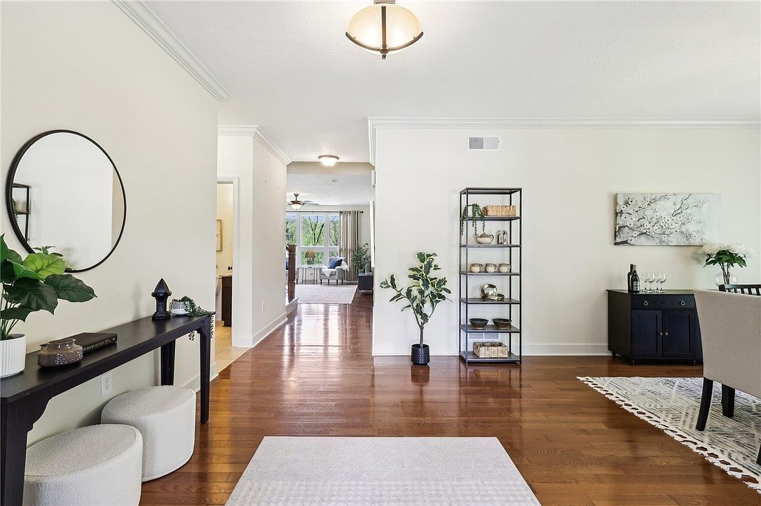 This bright entryway opens into a spacious living area, featuring warm hardwood floors that extend throughout. The walls are painted in a soft, neutral tone, creating a calm and welcoming ambiance. On the left, a sleek black console table is paired with two round, cushioned stools beneath, accompanied by a round mirror and potted greenery adding fresh touches. Straight ahead is a corridor leading further into the home, where large windows flood the space with natural light. To the right, an open shelving unit holds tasteful decor pieces, while a black side cabinet below an abstract wall art complements a dining area partially visible with cushioned chairs and a patterned rug.