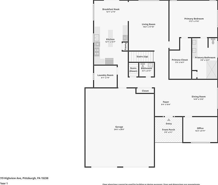 This floor plan reveals a well-organized layout emphasizing a harmonious flow between functional spaces. The garage, measuring 24’6” by 28’0”, anchors the left side, offering expansive parking with direct access into a centrally located laundry room and kitchen. The kitchen, outfitted with a central island, is adjacent to a cozy breakfast nook, making it ideal for casual meals. The sizable living room (14’2” by 17’10”) sits in the center and connects seamlessly to the kitchen, enhancing openness. A sizeable primary bedroom suite includes a large closet and bathroom, while the foyer leads to a formal dining room and a compact office near the entrance, illustrating both practicality and comfort in this home’s design.