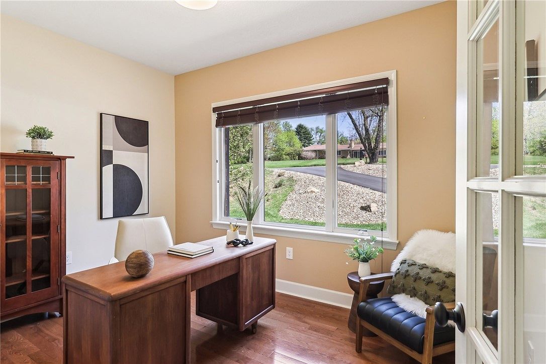 This cozy home office nook features warm beige walls contrasted by crisp white trim around a large window, filling the space with natural light and views of lush greenery outside. A sturdy wooden desk with clean lines rests on rich hardwood floors, accompanied by a sleek white chair that adds a contemporary touch. To the left, a wooden cabinet with glass-paneled doors enhances the room’s functionality while adding classic charm. A black leather armchair with a textured cushion and soft throw provides a comfortable seating option. Minimalist artwork with geometric patterns brings subtle modern flair to the space.