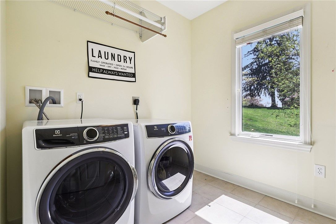 This laundry room features a clean, functional layout with side-by-side front-loading washer and dryer units in a sleek white and black finish. The walls are painted a soft, light yellow, creating a warm and inviting atmosphere. Natural light fills the room through a large window with white trim, offering a refreshing view of lush greenery outside. Above the appliances, a wooden rod and rack provide added utility for hanging clothes. A charming black and white sign adds a playful touch to the wall. The tiled floor in light beige tones completes the simple, practical design of this bright laundry space.